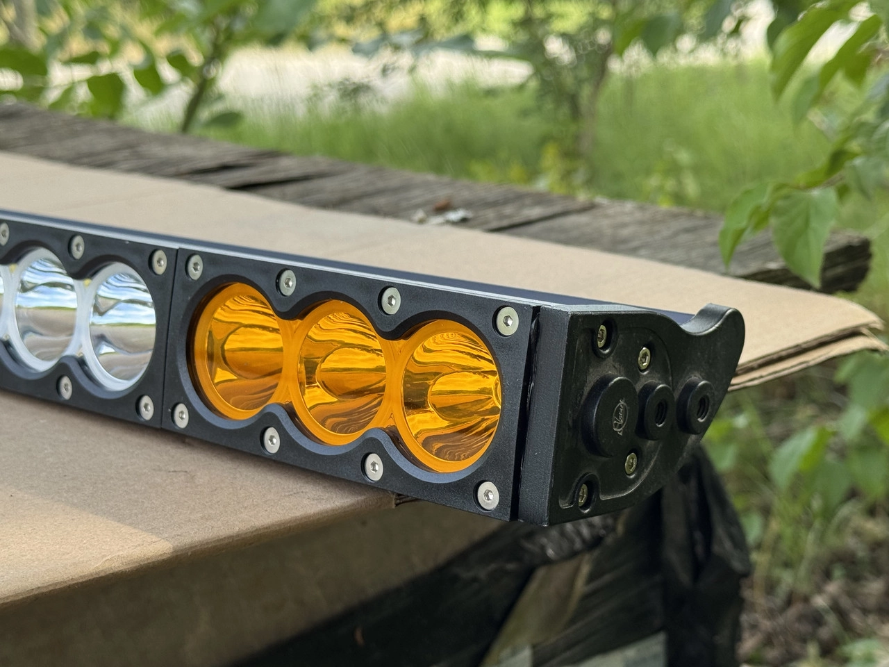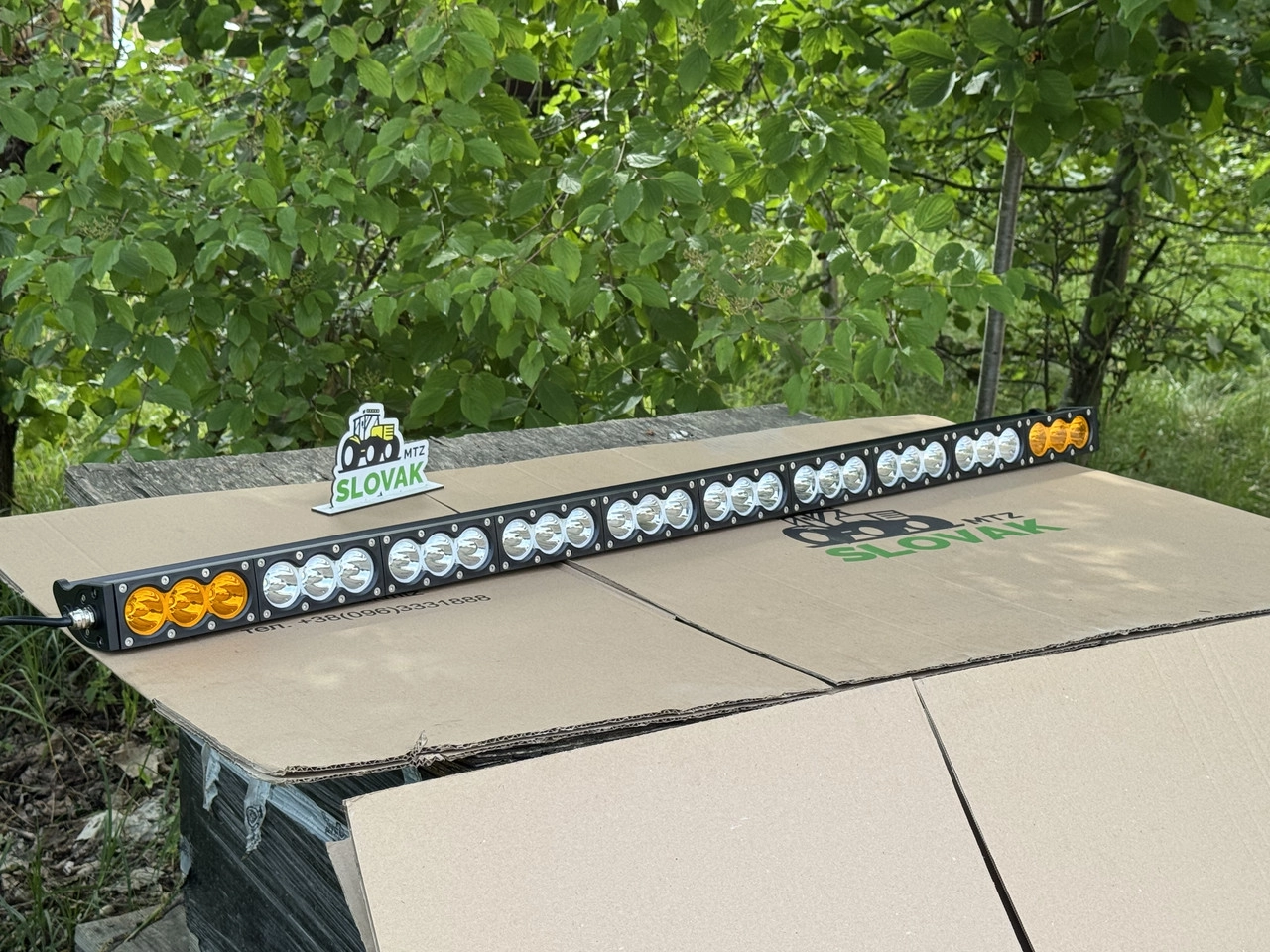 Світлодіодна балка 300W 30-диод (комбіноване світло: білий, жовтий або разом) Опис: Потужна світлодіодна балка BAR-Y1 забезпечує яскраве комбіноване освітлення робочої зони та безпеки руху. Центральний ряд діодів дає сильне біле світло для роботи вночі, а бокові жовті діоди можна вмикати окремо як додатковий контур для кращої видимості в дощ чи туман, або разом з білим для максимальної потужності. Підходить для монтажу на трактори, позашляховики, комбайни, лісову та будівельну техніку. Технічні характеристики: Тип світла: комбіноване — можна окремо білий, окремо жовтий, або обидва одночасно Діоди: 24 білих + 6 жовтих (по 3 з кожного боку) Корпус: алюміній, пиловологостійкий (IP67) Живлення: 12–24 V Довжина балки: ~140 см (уточнити) Монтаж: універсальні кріплення в комплекті Виробник: SLOVAK Переваги: ✅ Потужне біле світло для роботи в темряві ✅ Жовті діоди для умов поганої видимості ✅ Можна налаштувати режим: лише білий, лише жовтий, або обидва ✅ Надійний металевий корпус ✅ Легко встановлюється на дах, бампер чи дугу