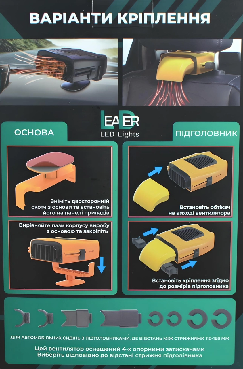 Тепловентилятор в авто от прикуривателя на підкладці 24V, 200W з темпер. захистом Два режима холодный воздух 5w горячий воздух 200w Работает от прикуривателя, 24 В Потребляемая мощность: 200 Вт Кнопка включения: есть Материал корпуса: пластик Легкая установка на двусторонний скотч Длина шнура: 1,75 метра