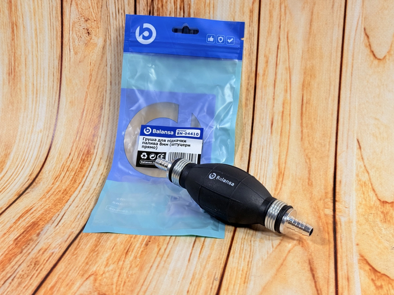 Груша для підкачування палива 8мм (штуцера прямо) Balansa BN-04410 Груша для підкачування палива Balansa BN-04410 призначена для ручного підкачування дизельного або бензинового палива в систему живлення двигуна. Забезпечує заповнення паливної магістралі після заміни фільтра, ремонту або спорожнення паливного бака. Використовується у тракторах, човнових моторах, автомобілях, мінітехніці та мотоблоках. Характеристики: Виробник: Balansa Модель: BN-04410 Внутрішній діаметр шланга: 8 мм Тип штуцерів: прямі Матеріал корпусу: гума високої щільності Вбудований зворотний клапан: так Призначення: ручна підкачка дизельного/бензинового палива Сумісність: трактори, човни, мототехніка, автомобілі Переваги: Швидка і зручна підкачка палива вручну Надійні та герметичні з'єднання Підходить для дизельних і бензинових систем Стійка до зносу та дії пального Висока якість від бренду Balansa Застосування: Груша використовується для ручного заповнення паливної системи у дизельних або бензинових двигунах, коли немає автоматичної підкачки. Підходить для моторів човнів, тракторів, генераторів, мінітехніки, мотоблоків тощо.