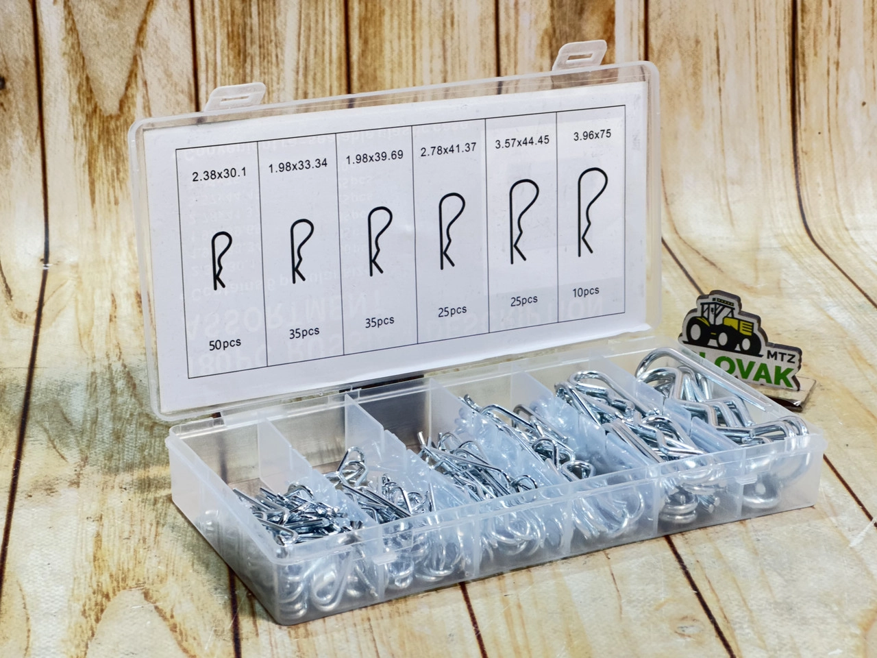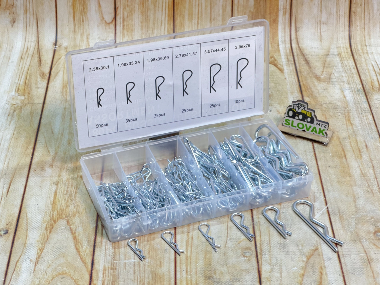 Набір шплінтів "волосинка" (Hairpin Cotter Pin) — 180 шт. / 6 розмірів Опис: Компактний набір шплінтів пружинного типу «волосинка» (R-type) для фіксації валів, пальців, тягових з’єднань у причепах, МТЗ, навісному обладнанні, техніці. Всього 180 шт. у 6 популярних розмірах. Зручно зберігати та транспортувати завдяки пластиковому боксу. Характеристики: Загальна кількість: 180 шт. Кількість розмірів: 6 Розміри (діаметр × довжина): • 2.38×30.1 мм — 50 шт. • 1.98×33.34 мм — 35 шт. • 1.98×39.69 мм — 25 шт. • 2.78×41.37 мм — 25 шт. • 3.57×44.45 мм — 10 шт. • 3.96×75 мм — 35 шт. Матеріал: сталь з цинковим покриттям Тип: hairpin cotter pin (пружинний шплінт) Формат: пластиковий кейс